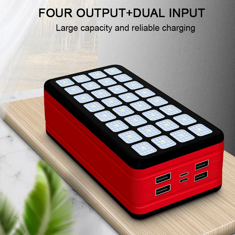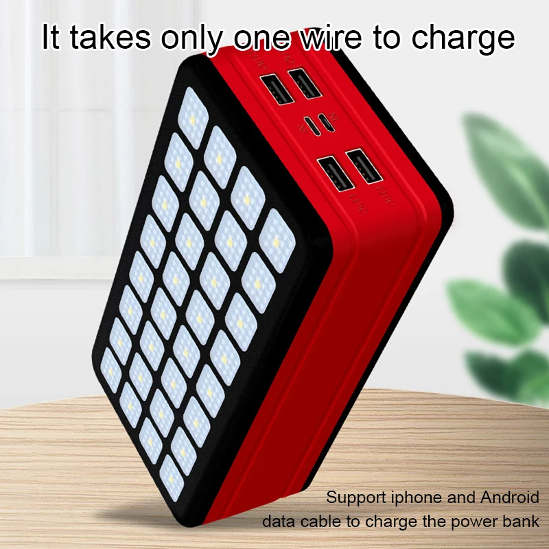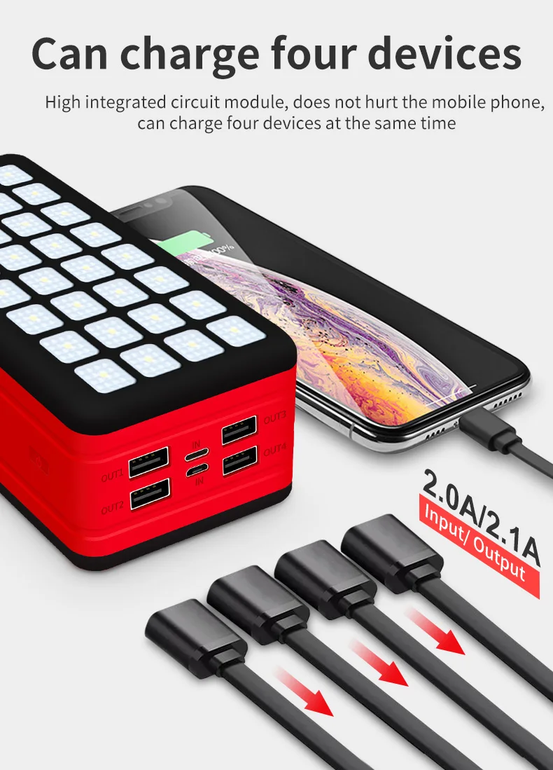 Feature:Rugged and durable, compact size,The portable charger is made of high-quality ABS material and lithium polymer battery, very sturdy and durable. It comes with 4 USB andcamping lights