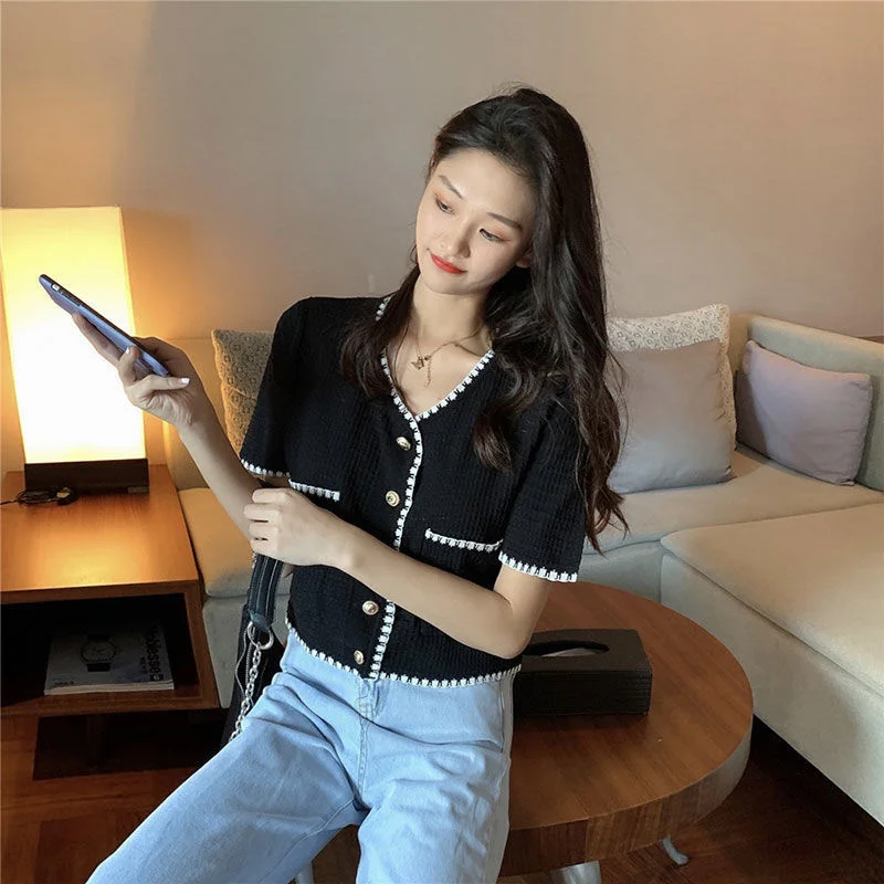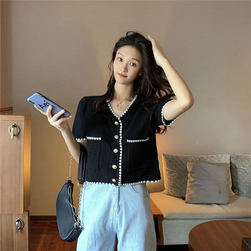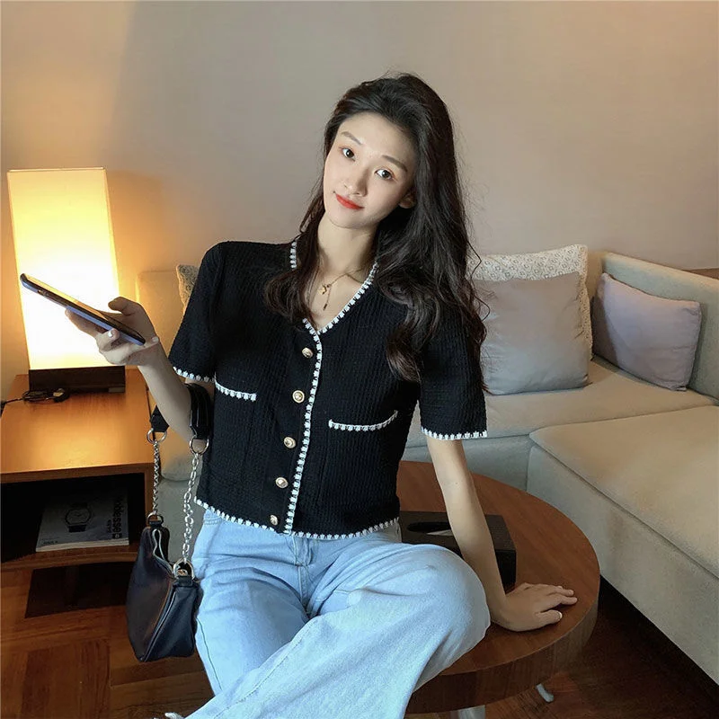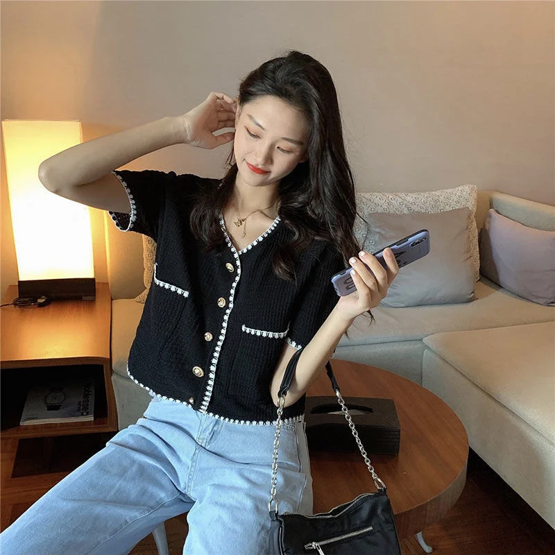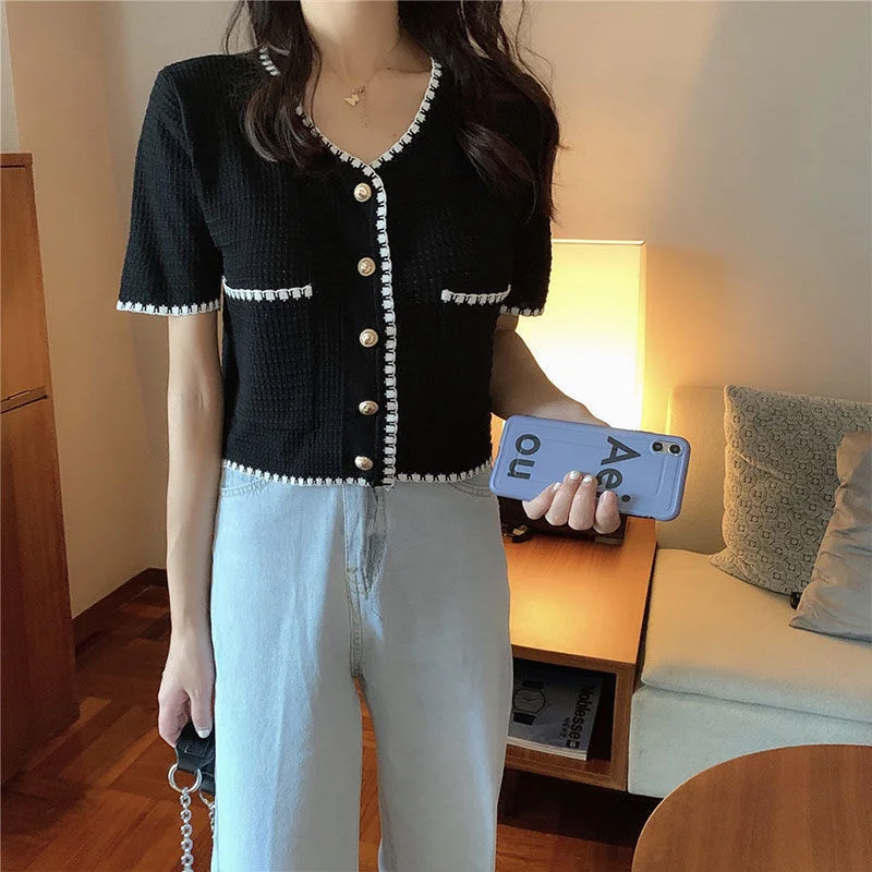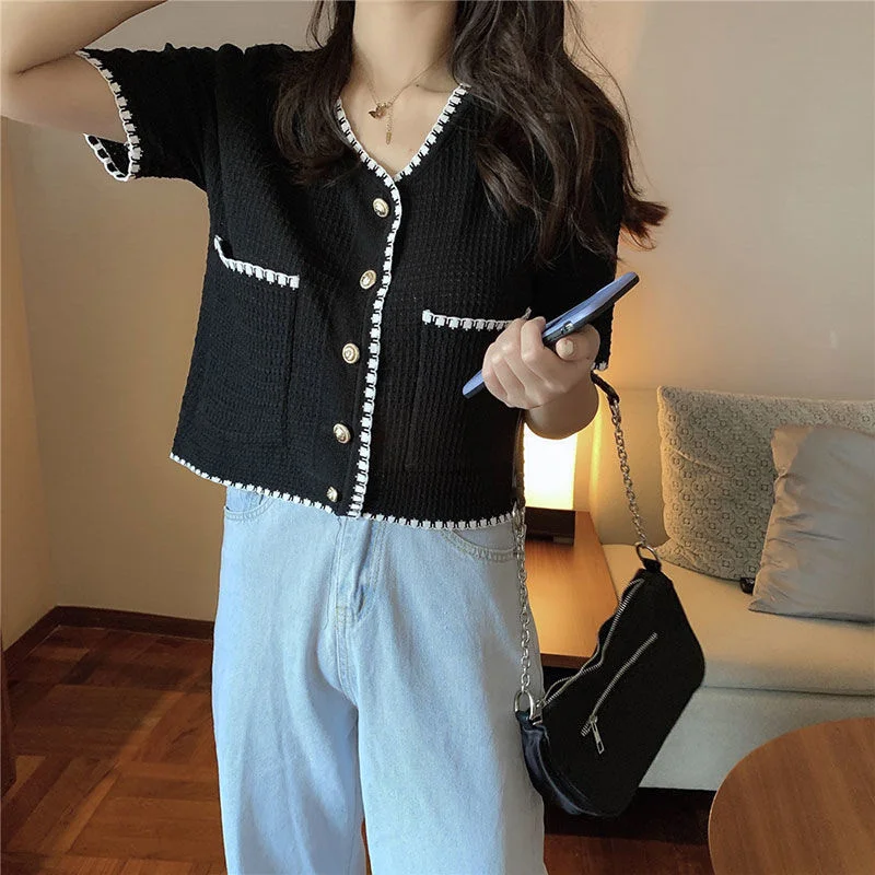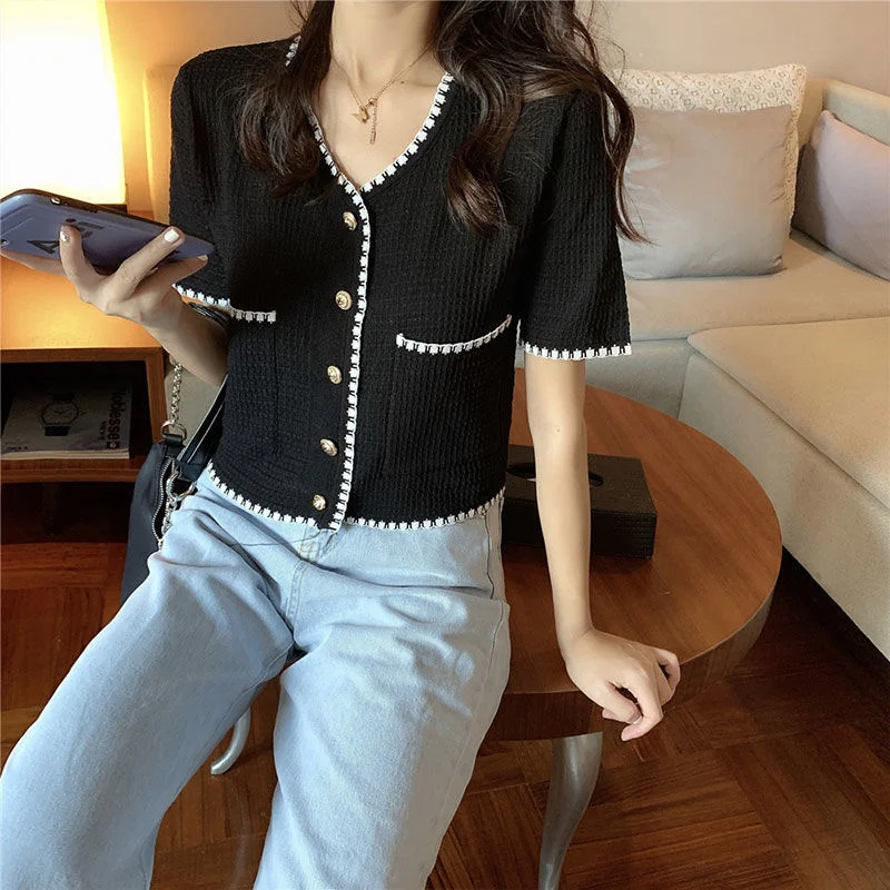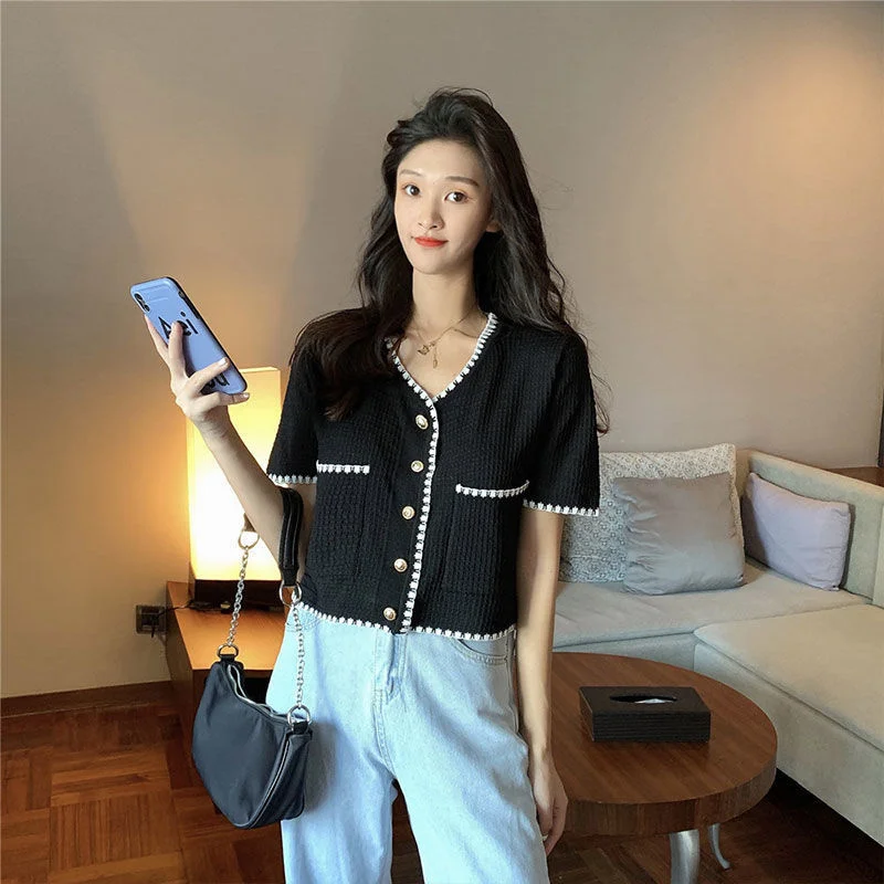 Black Knitwear Short Sleeve Top Lady Cardigan Crop Top