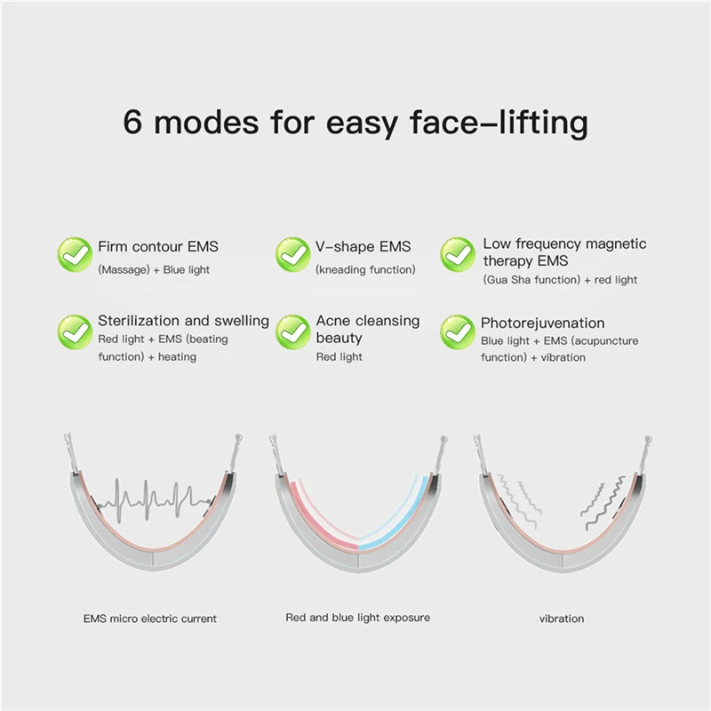 Modes: contour tightening, V-shaped shaping, low frequency magnetic therapy, sterilization and swelling reduction, acne cleansing, photorejuvenation