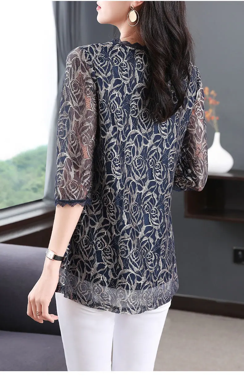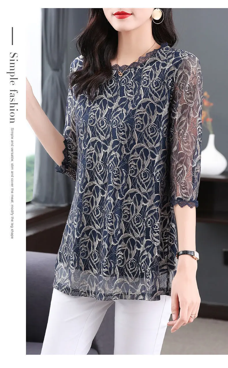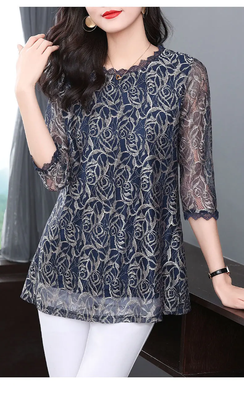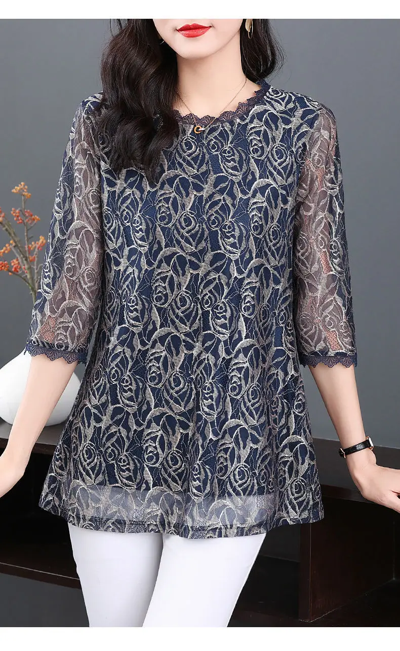 Elegant Printed Hollow Out Lace Gauze T-shirt S-Neck Loose Pullover Tops