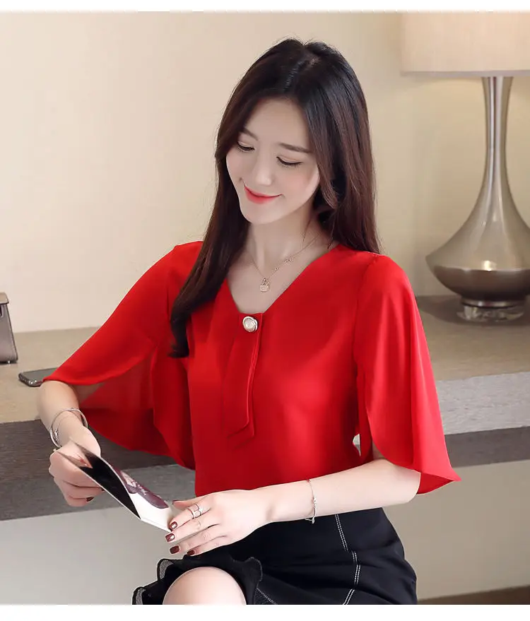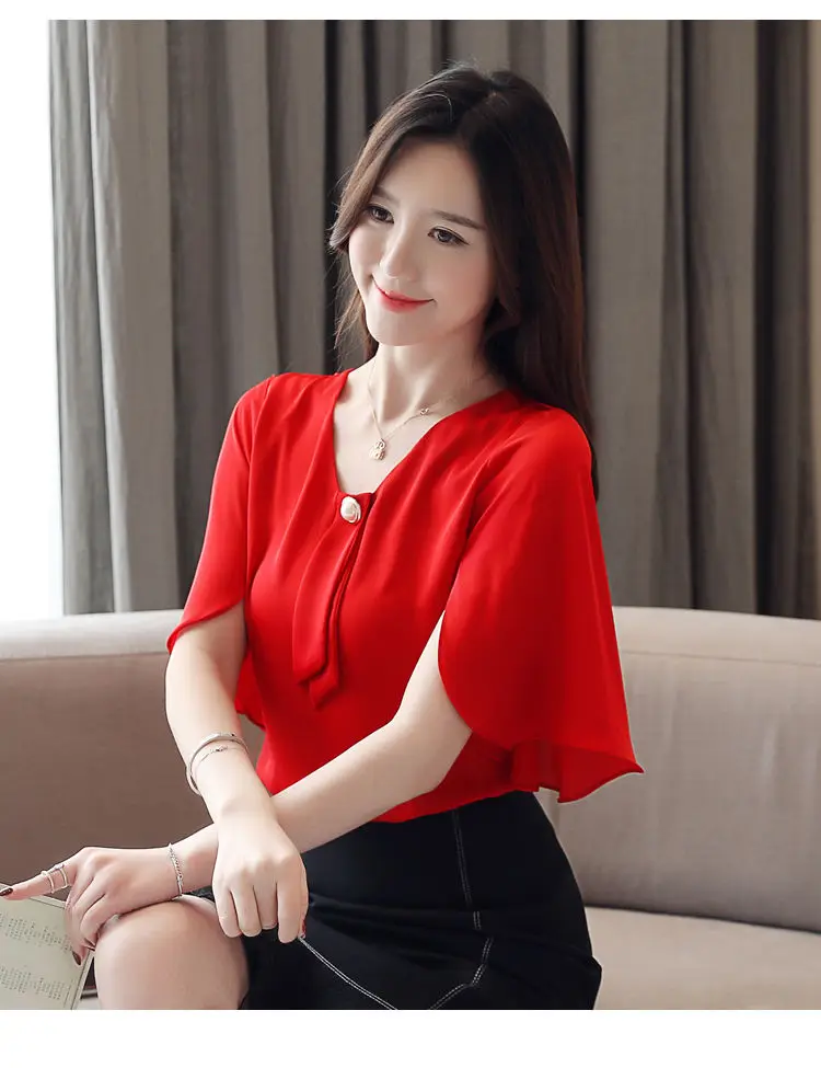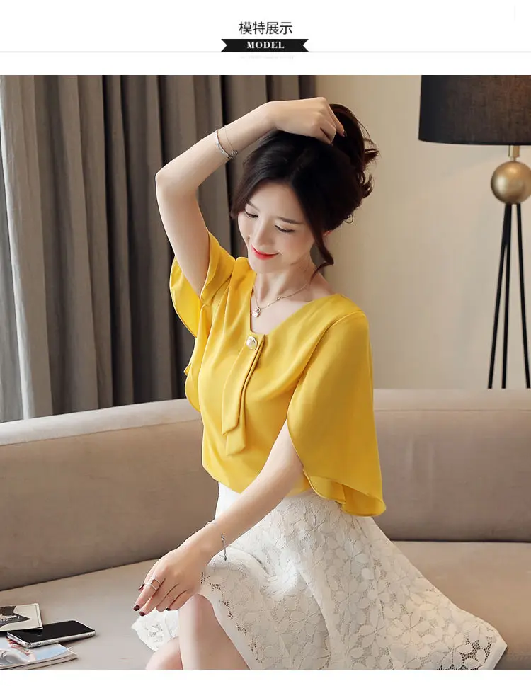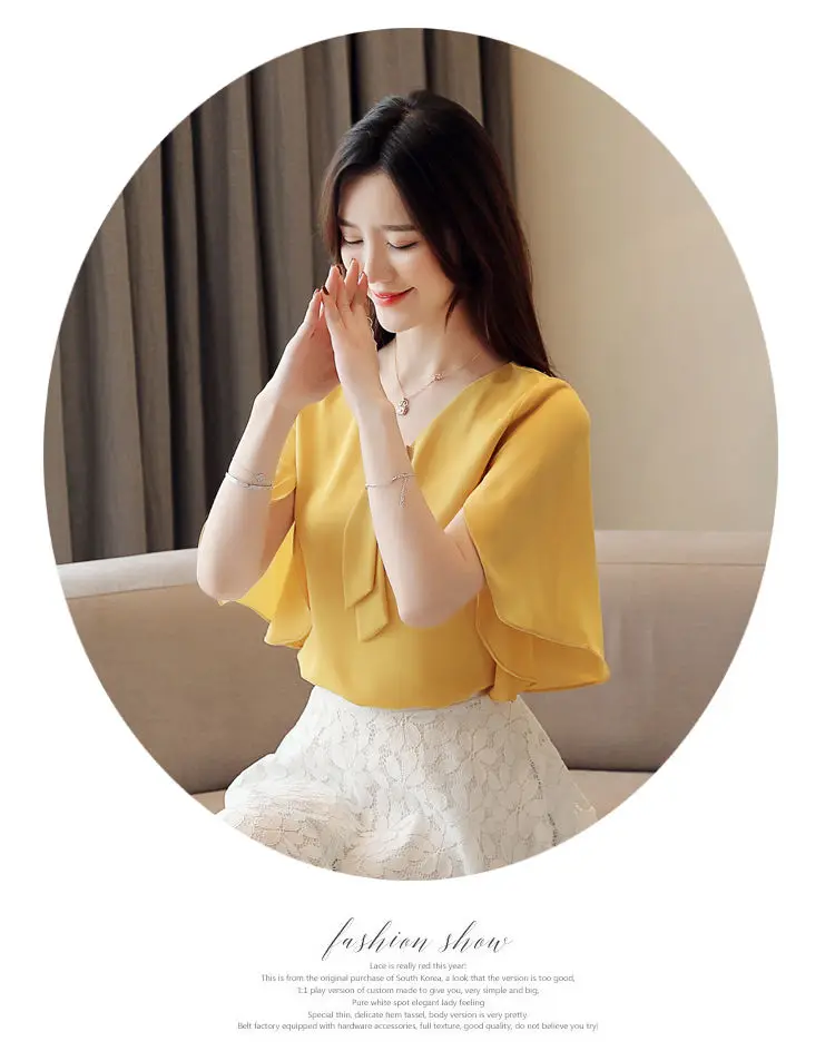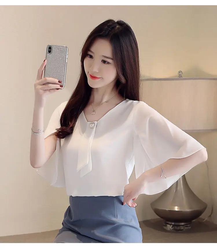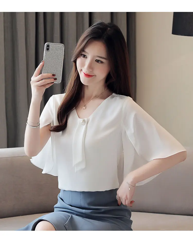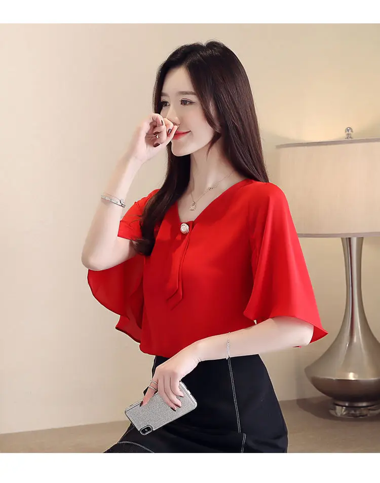 Elegant V-Neck Butterfly Sleeve Tie Beading Loose Chiffon Summer Blouse