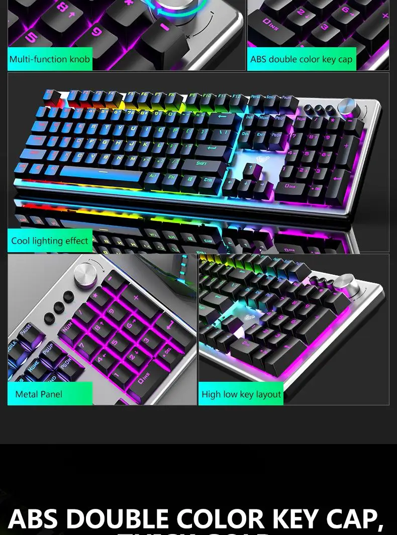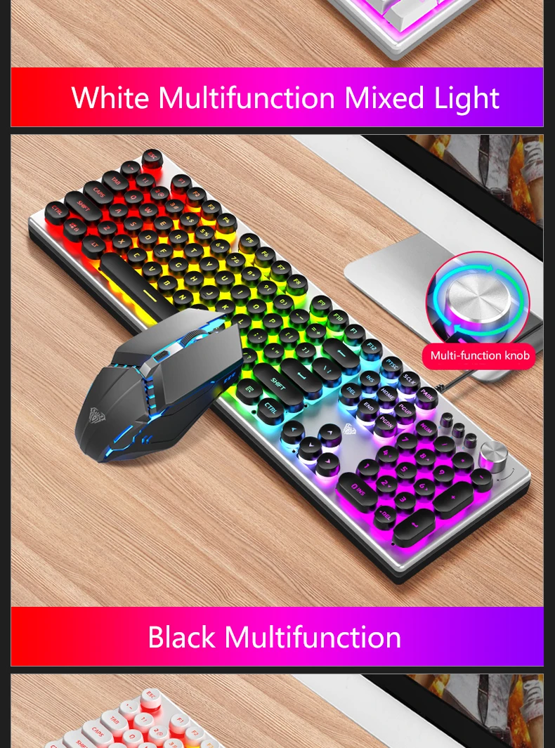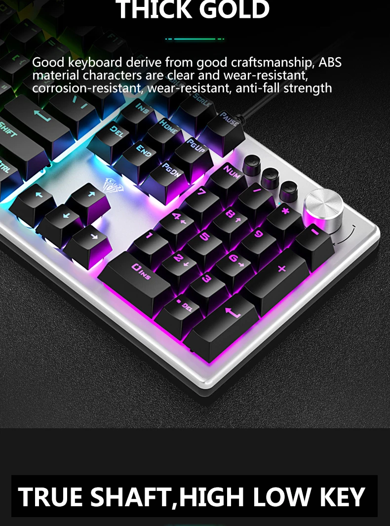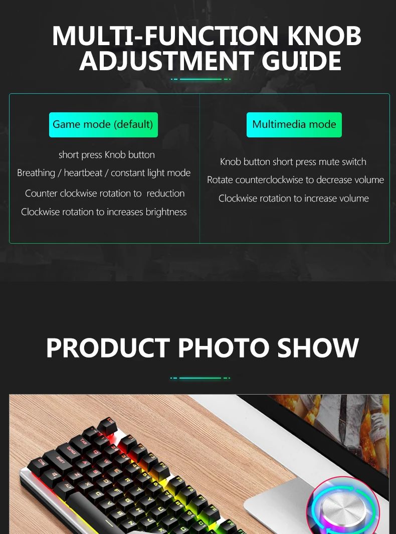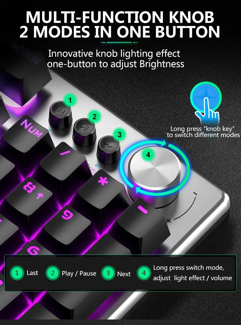 【Multi-function Alloy Knob】In game mode, you can change the lighting effect of the keyboard, and in multimedia mode, you can adjust the volume and switch songs