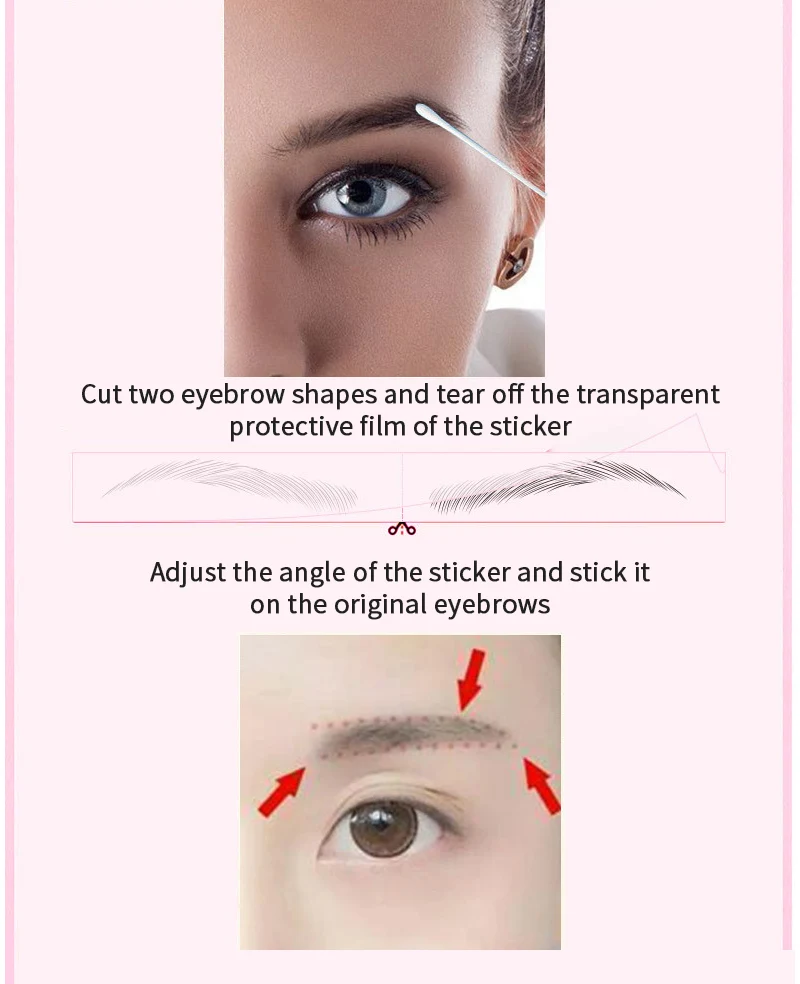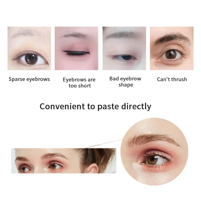 features: 1.Stick-on Eyebrows -- Stickers to wear quikly to create full, natural brows with desirable brow shape. 2.Hair-like Texture --- Stimulate microblading effect with hair-like & natural brow look. Seamlessly blend with your own brows. 3.Natural,Waterproof,Long-lasting, Easy to wear
