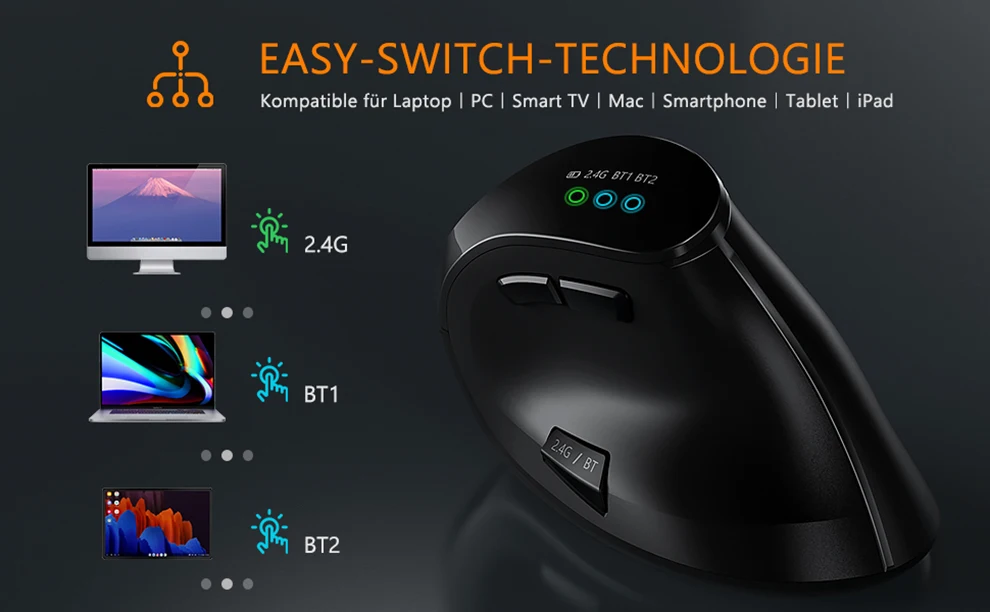 Pairing with three devices at the same time?There are three ways to connect the vertical mouse: Bluetooth 3.0, Bluetooth 5.0, USB/receiver. You can use another device for each connection mode. The switching between Bluetooth and USB wireless devices works via button and optical display on the bottom. Once set up, you can switch between the devices as desired