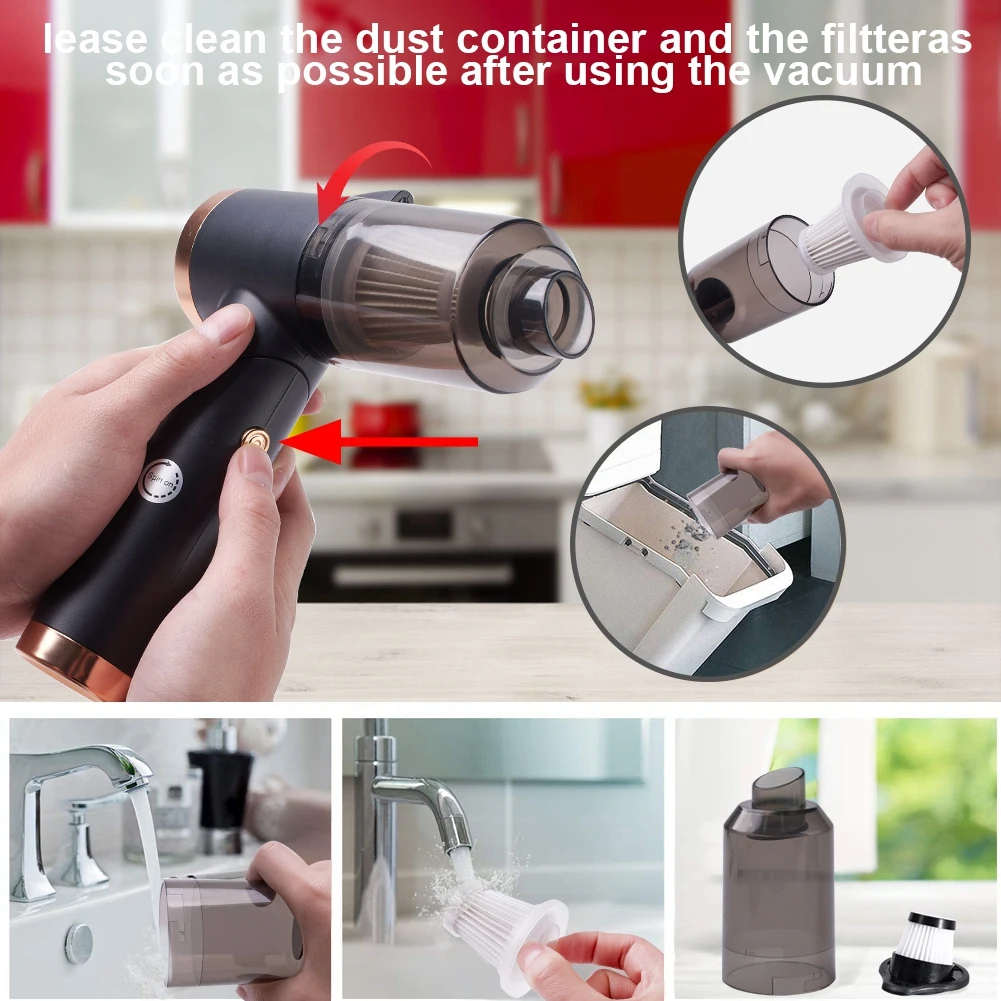 1.Deep cleaning: our Handheld vacuum utilizes a high power motor with suction up to 9Kpa. Durable use in wet/dry conditions, it can easily clean dust, crumbs, cat litter, pet hairs. Tips: The crevice nozzle can make the suction more powerful.