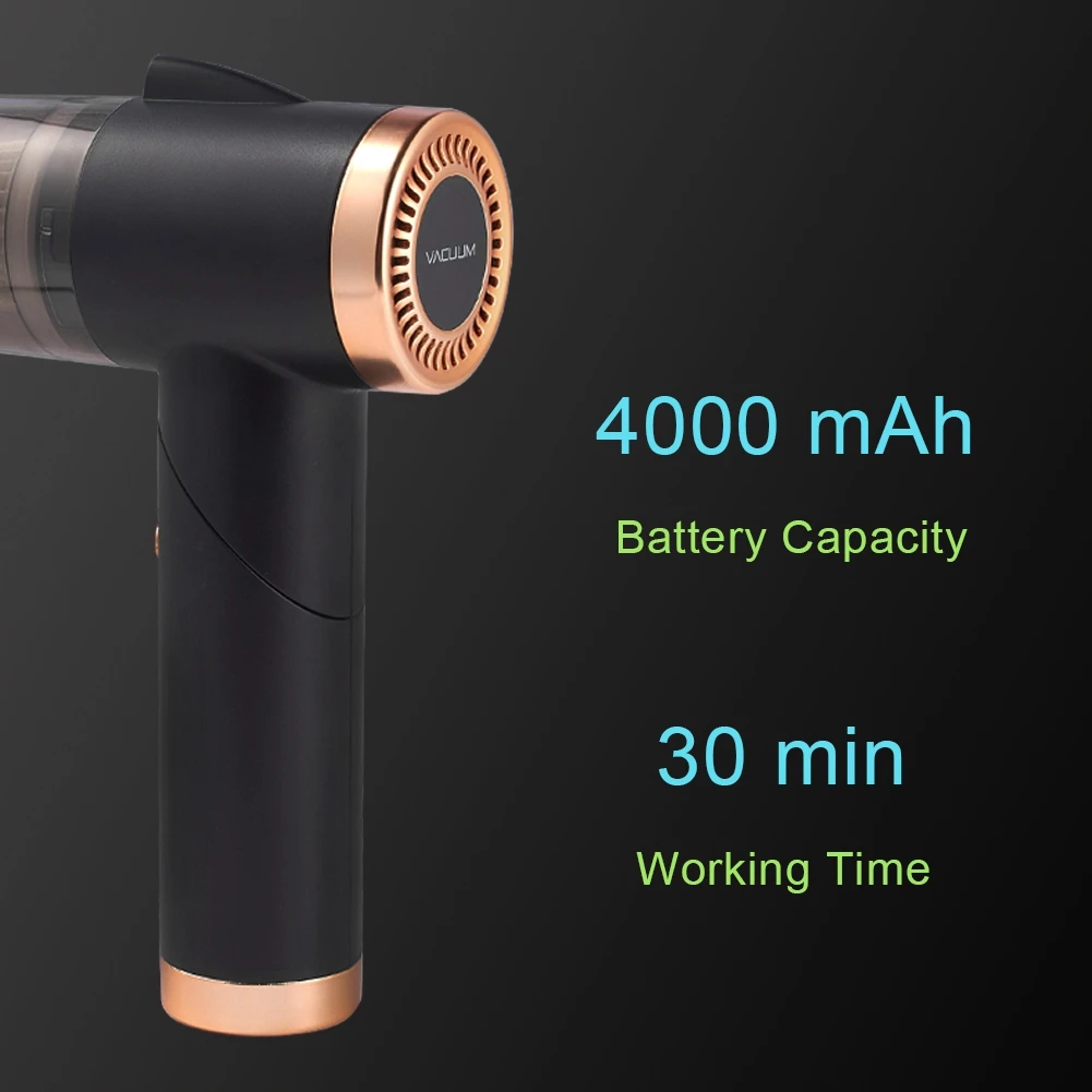 2.USB quick charge & more convenient: the cordless vacuum cleaner, built-in 4000mAh rechargeable battery, is light weight and portable for use at anywhere, only takes 3.5 hours to be fully charged, and could last 20-25 mins, Make your life easier.