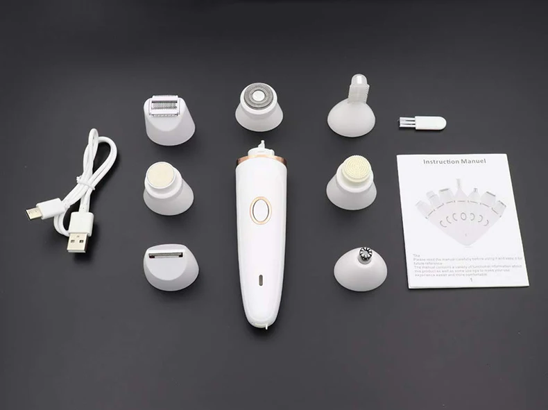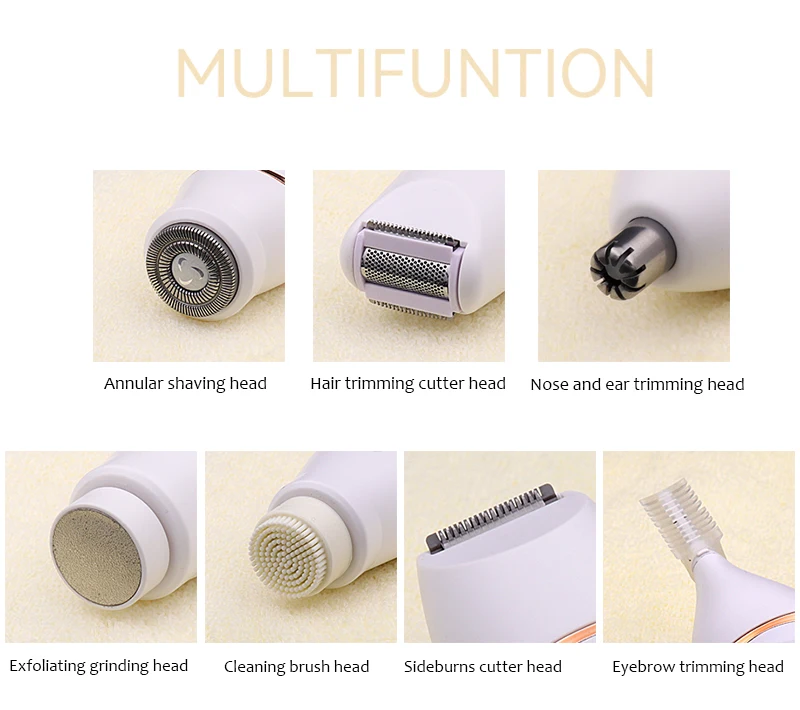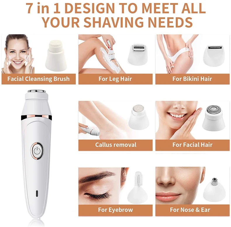 1. It comes with 7 interchangeable heads, Bikini Trimmer Head, Eyebrow Trimmer, Nose Hair Trimmer, Facial Hair Shaver, Facial Cleansing Brush, Foil Shaver and Callus Removal Heads. It is easy shaving your face, bikini privates, legs, arms, body hair and eyebrow with no irritation.