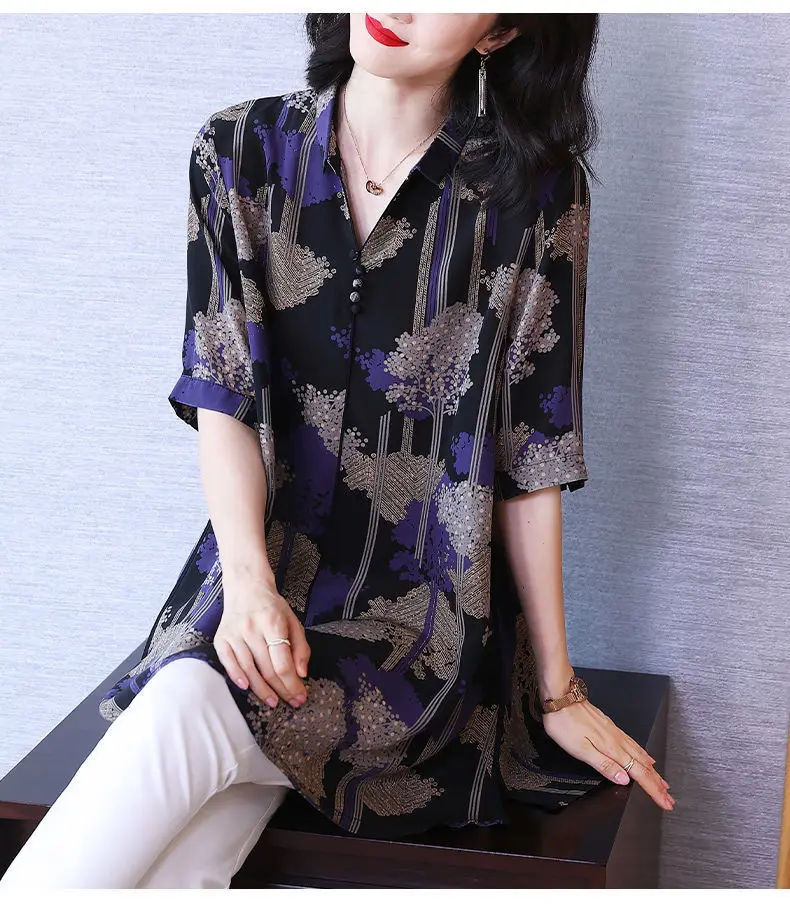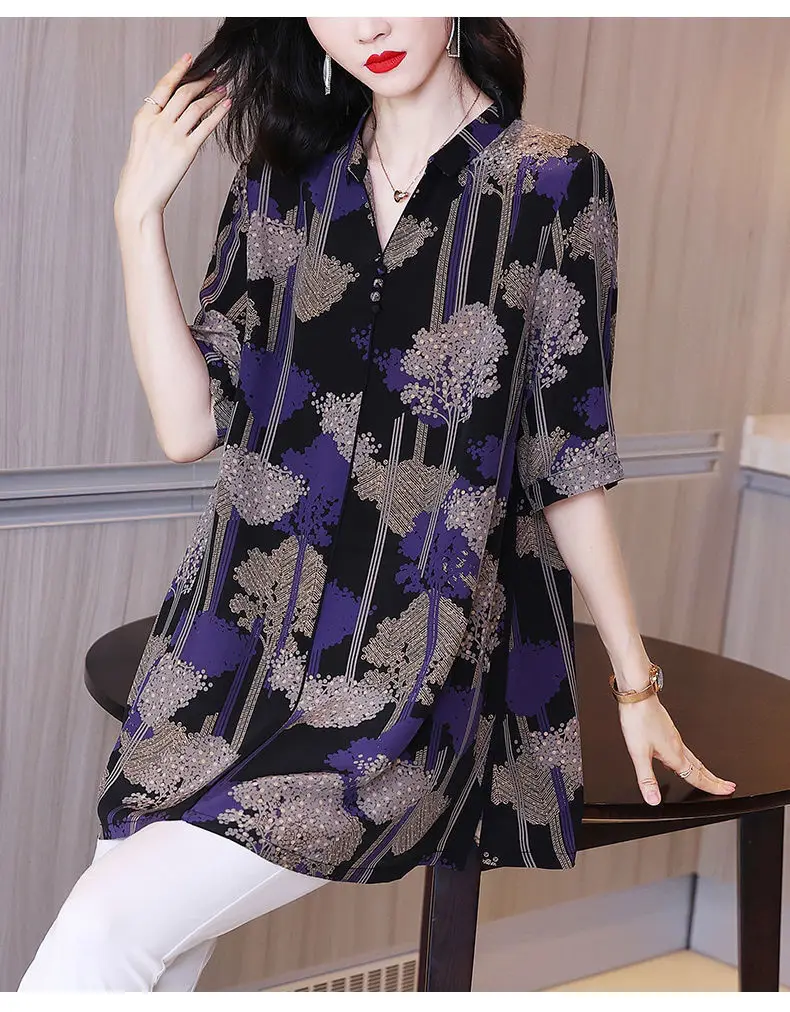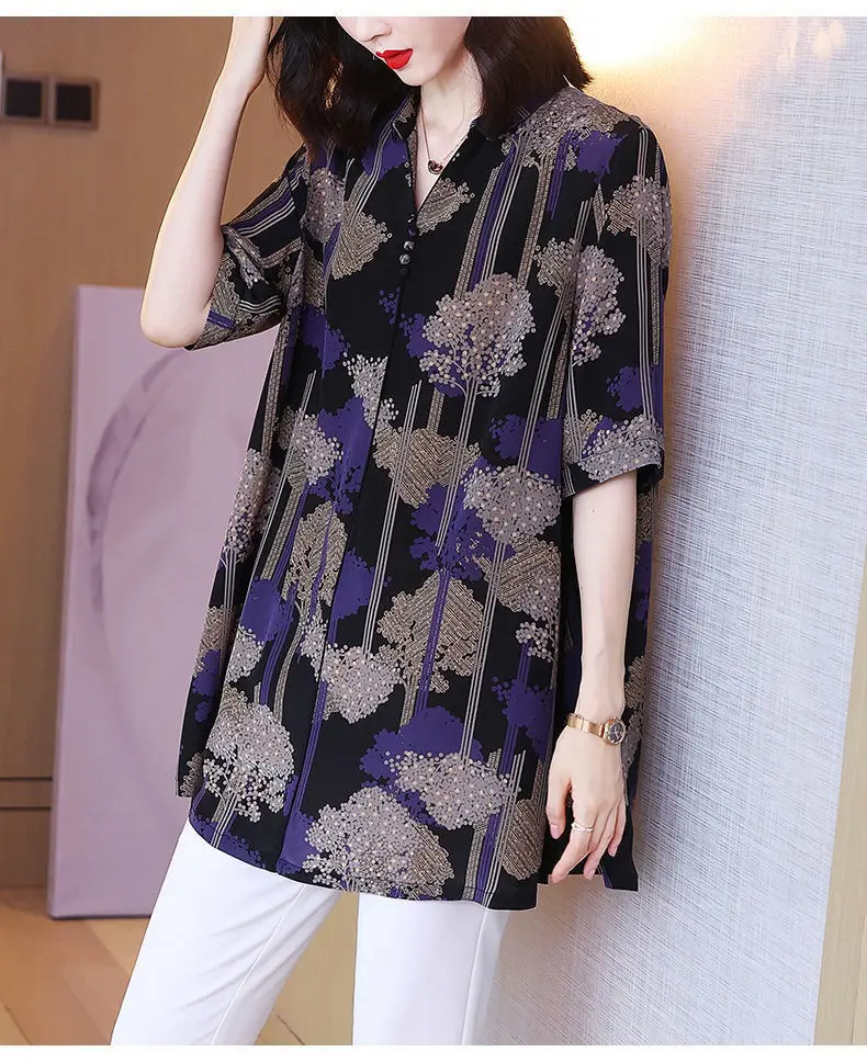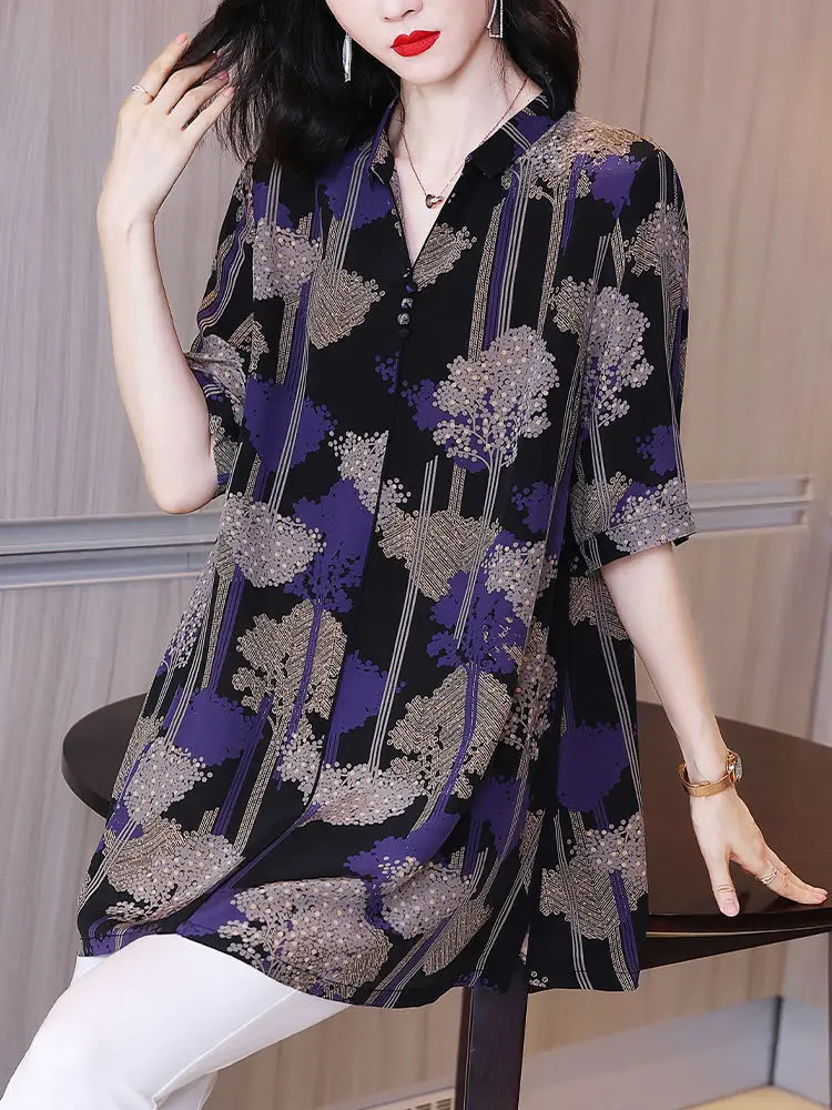 Fashion Elegant Printing Button Long Chiffon V-Neck Half Sleeve Loose Blouse