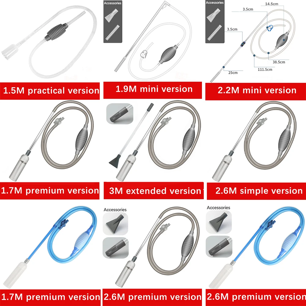 The total length is 3M, comes with three adapters, lengthened and thickened, to meet your various water cleaning needs, excellent quality, built-in filter fence, three-in-one for changing water and sand.