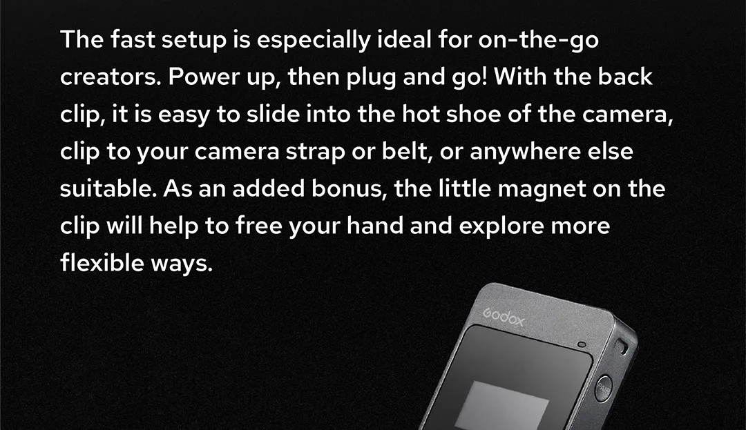 The fast setup is especially ideal for on-the-go creators.Power up, then plug and go.With the back clip, it is easy to slide into the hot shoe of the camera, clip to your camera strap or belt, or anywhere else suitable. Additionally, attaching the magnetic sheet to thebeltclipwill help to free yourhand and explore more flexible ways.