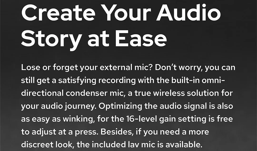 Withabuilt-in omni-directional condenser mic, it’s a true wireless solution for your audio production. Optimizing the audio signal is just as easy, with15-level gain setting to adjust at a press. Besides, it also includes a 1.2mlav mic that’s easy to clip onto your clothing.