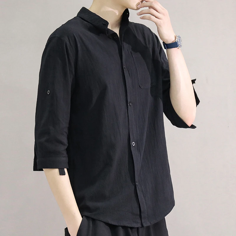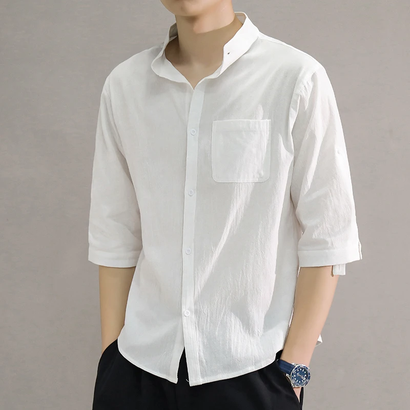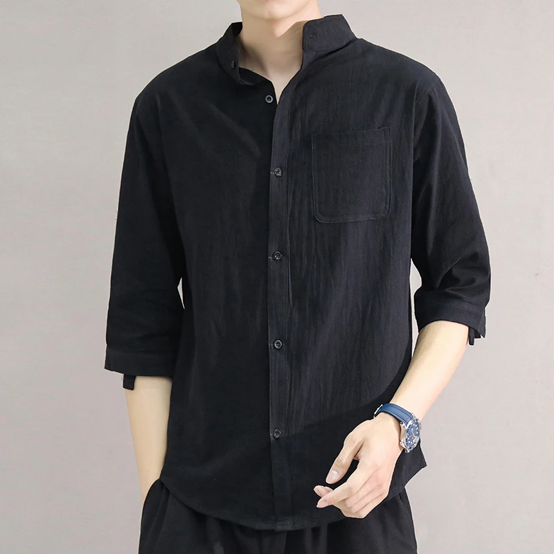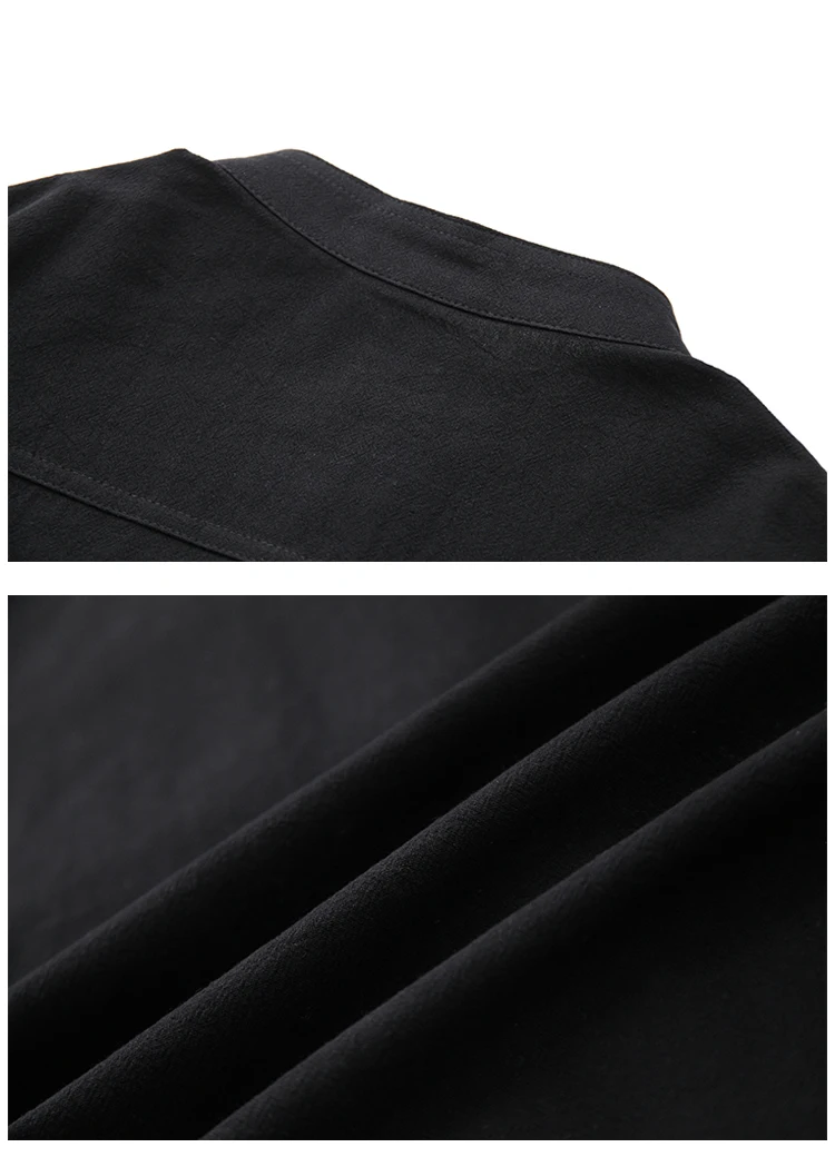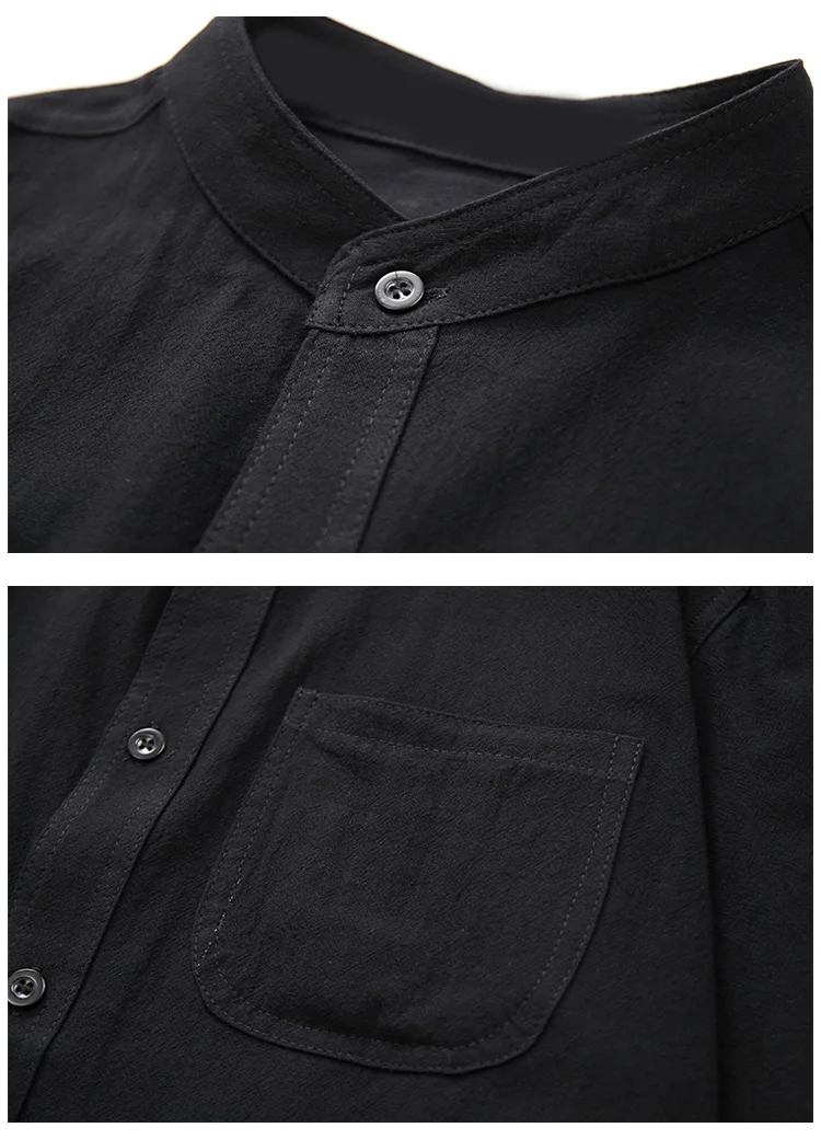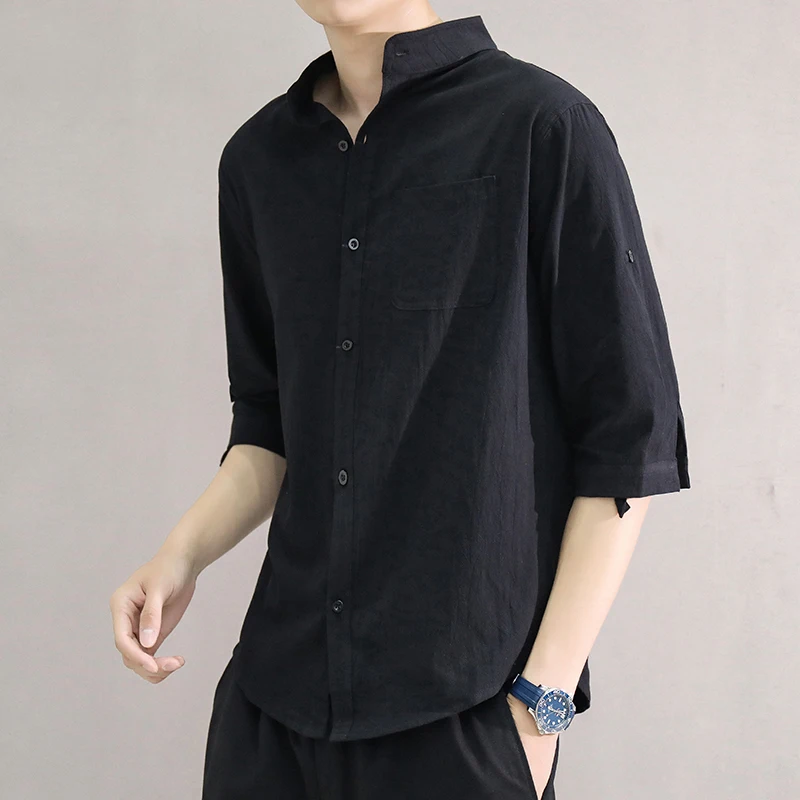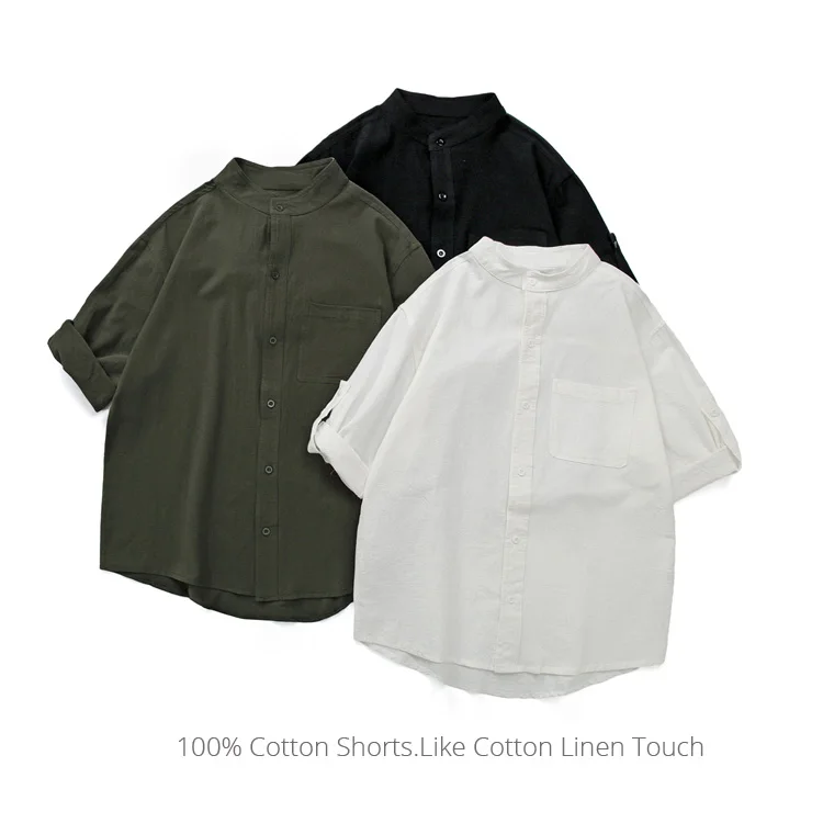 Harajuku Cotton Soft Half Sleeve Stand Collar Button White Black Male Blouse