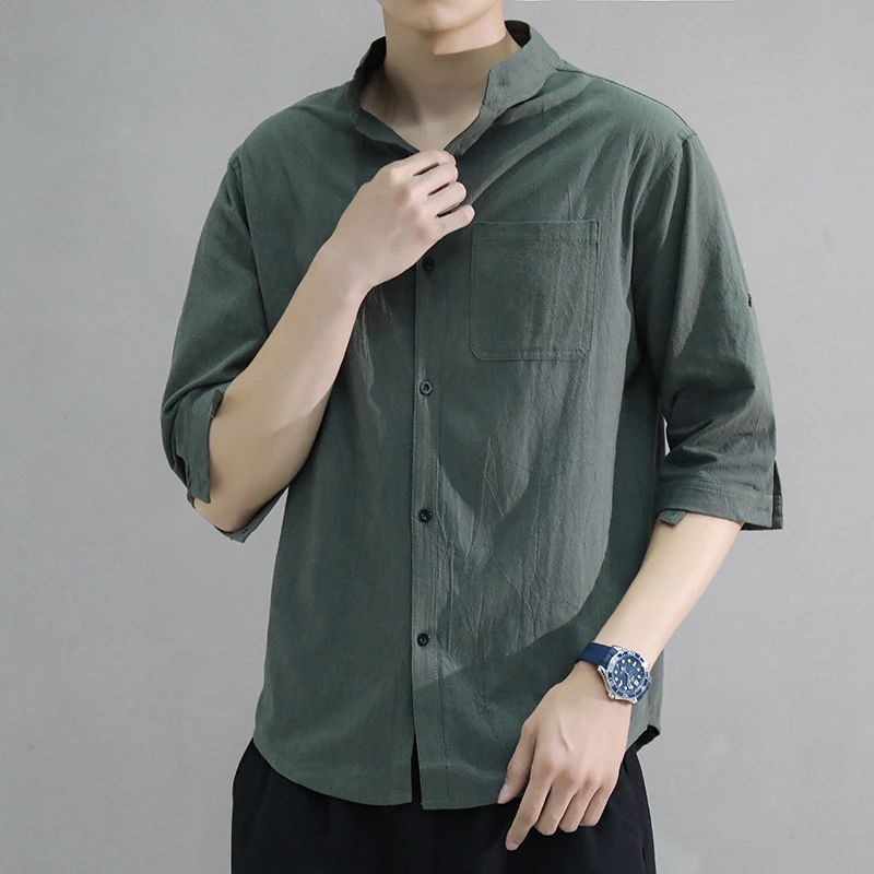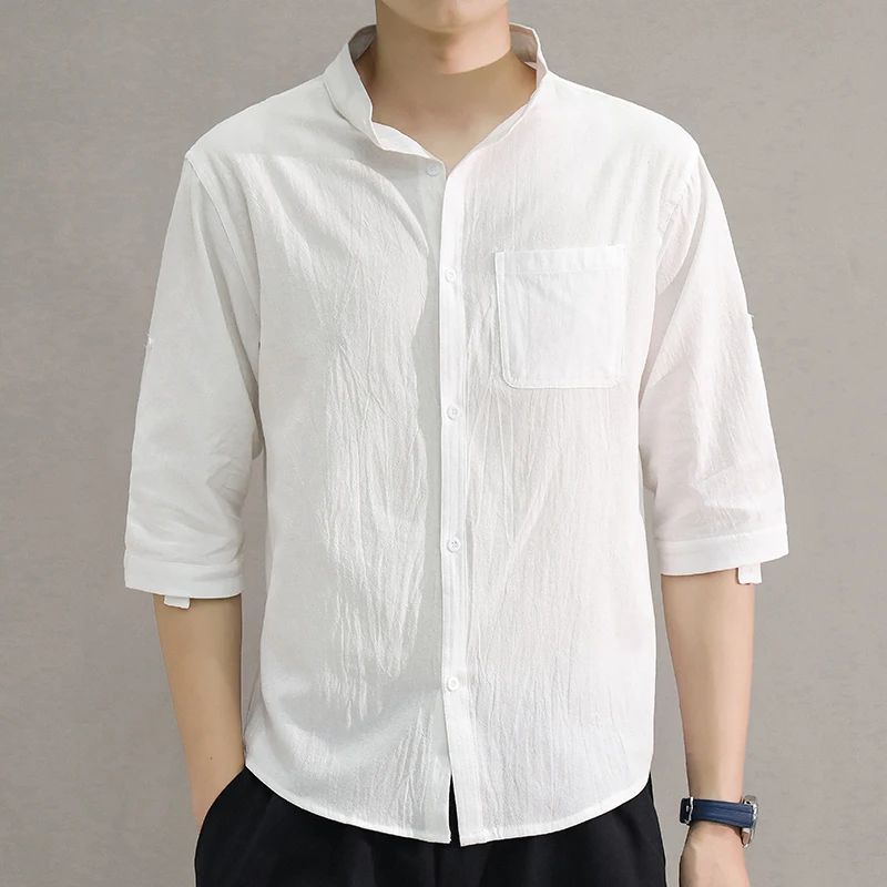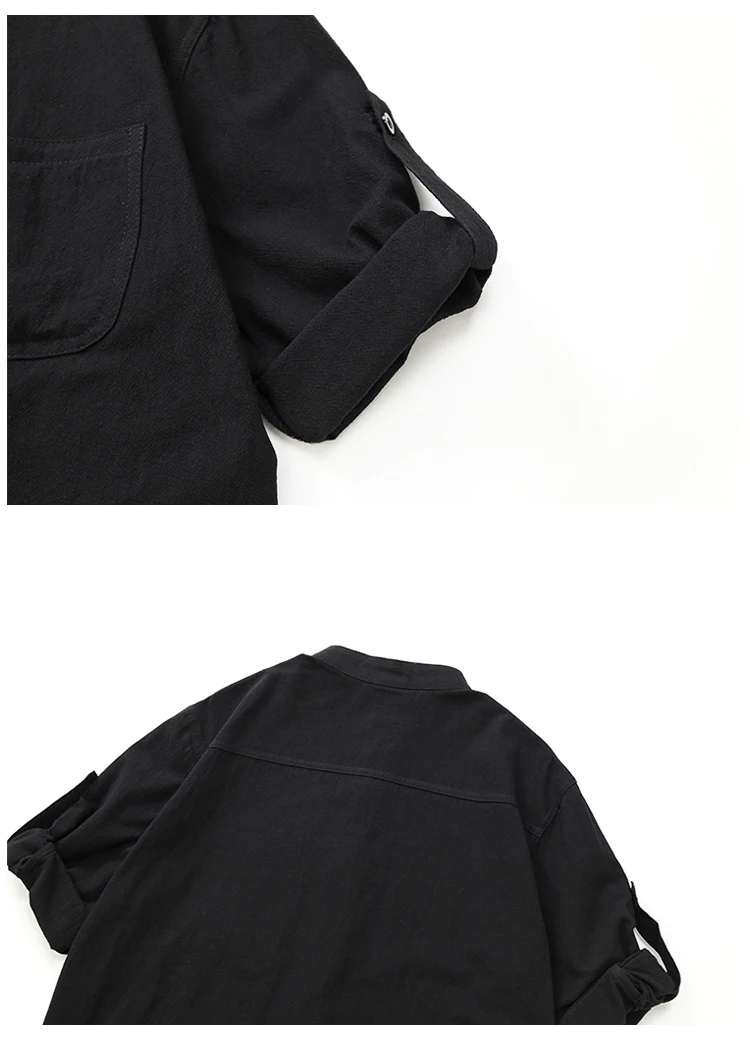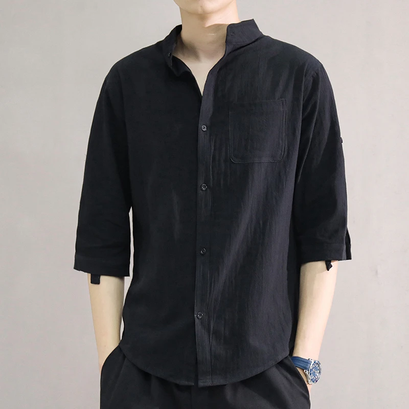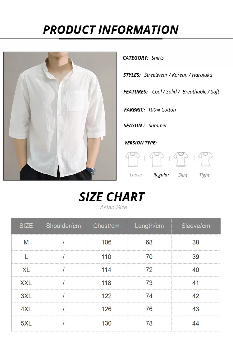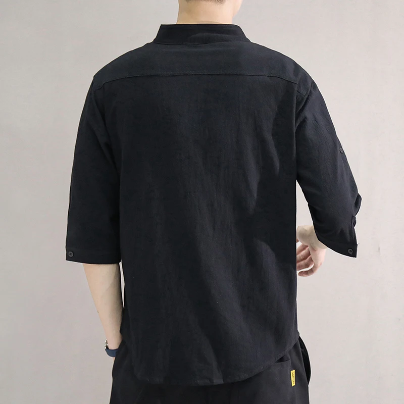 Harajuku Cotton Soft Half Sleeve Stand Collar Button White Black Male Blouse