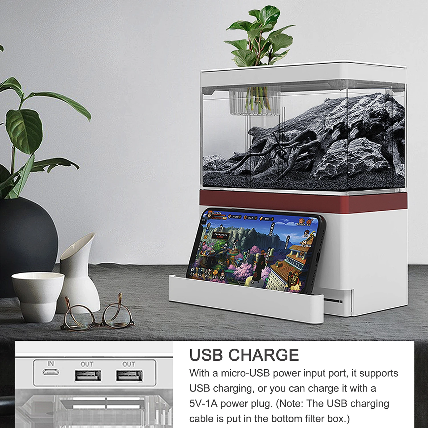 【USB Power Supply】The mini aquarium has one micro-USB power input port and two USB power output ports, thus, it supports to be powered by power bank, and it could also supply power to your mobile phone, tablet and laptop when it's connected to power supplies.Features: