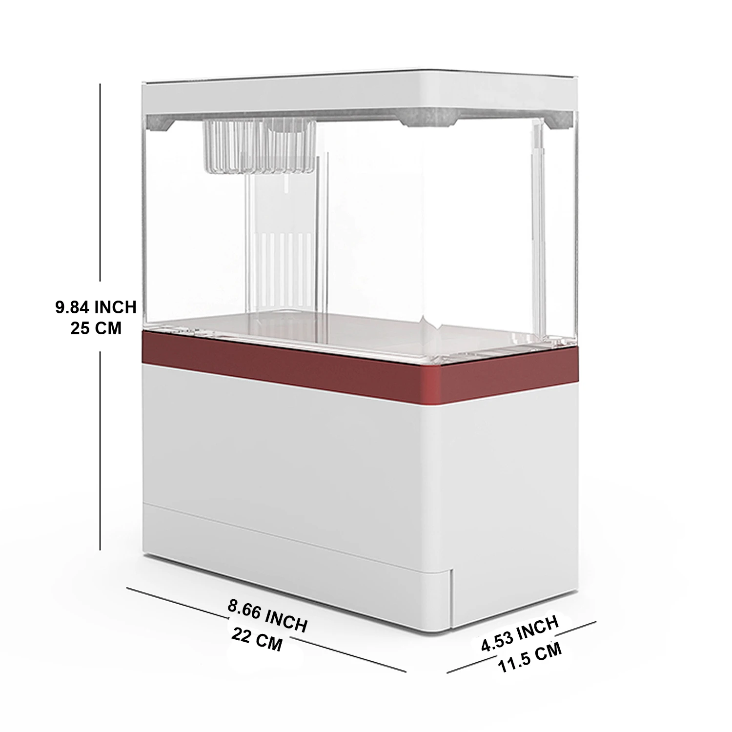 Size measures about 19x10x21.2 cm/7.48"x3.94"x8.34". Water tank is about 19x10x11.2cm/7.48"x3.94"x4.41". Compact desktop aquarium, suitable for both home and office.Package Includes: