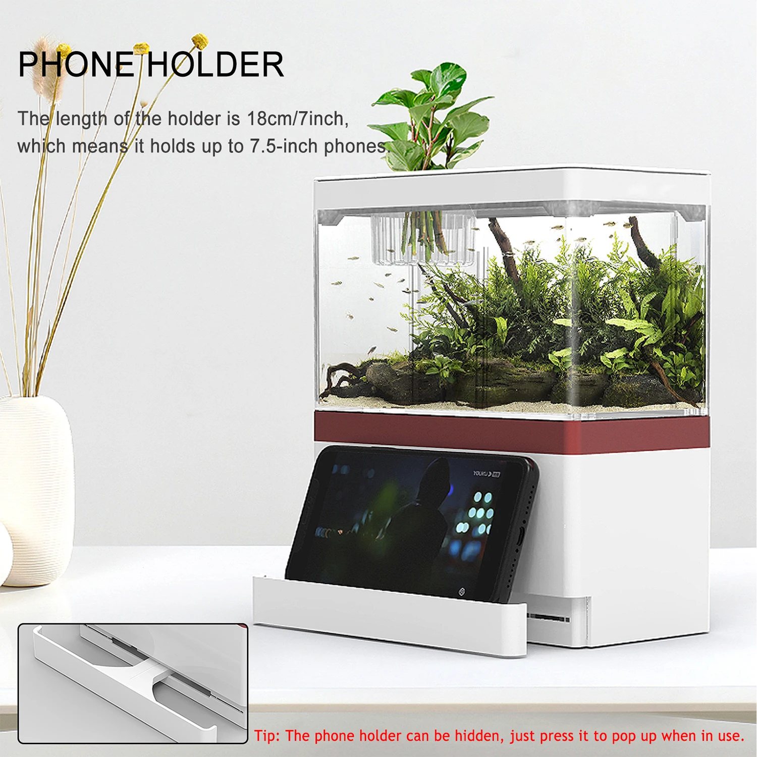 【Multifunctional Phone Holder】 There is a concealable bracket at the bottom of the front of the fish tank, which can be popped up by pressing it. You can put your mobile phone or tablet on the holder, so that you can watch TV while watching fishes, enjoy a relaxing leisure time after tiring work.