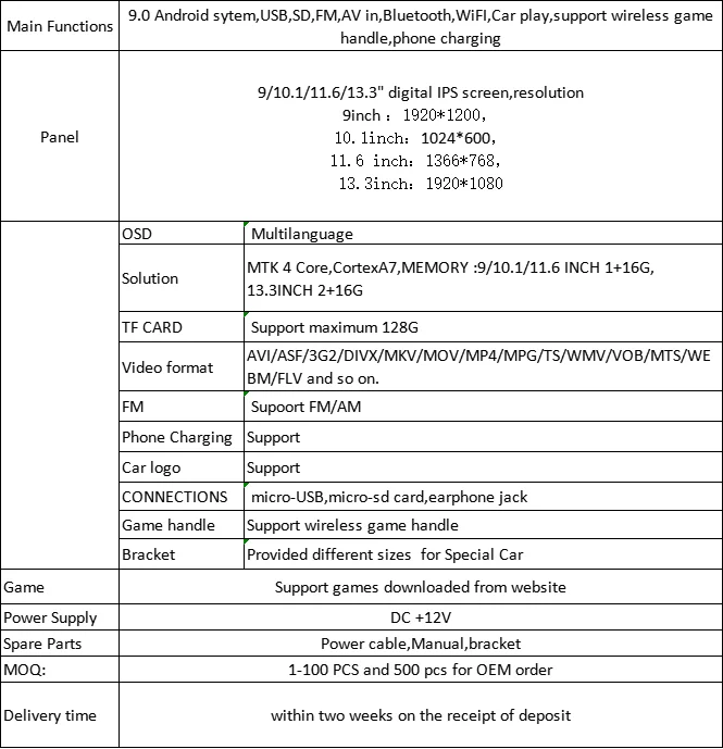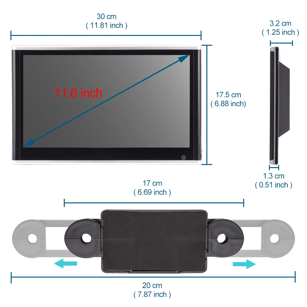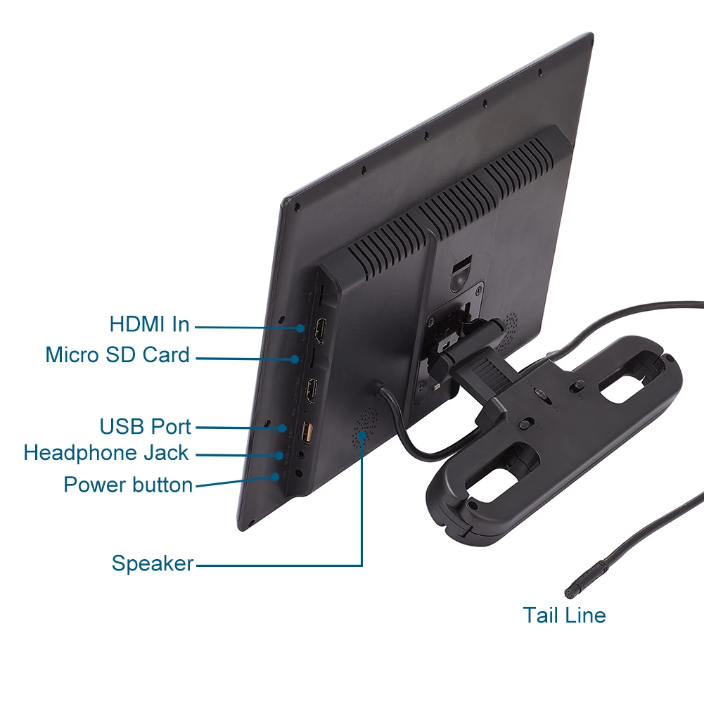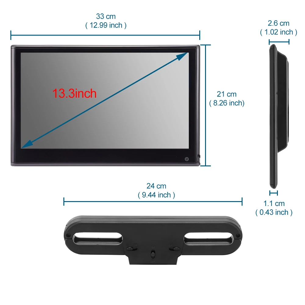 2.HD touch screen: 13.3-inch large screen. 1920x1200 resolution IPS touch screen. Support 4K HD video playback. The body is equipped with a TF card and a USB port, and supports up to 128GB of mobile memory device reading. The headrest monitor can be used in the car or at home.